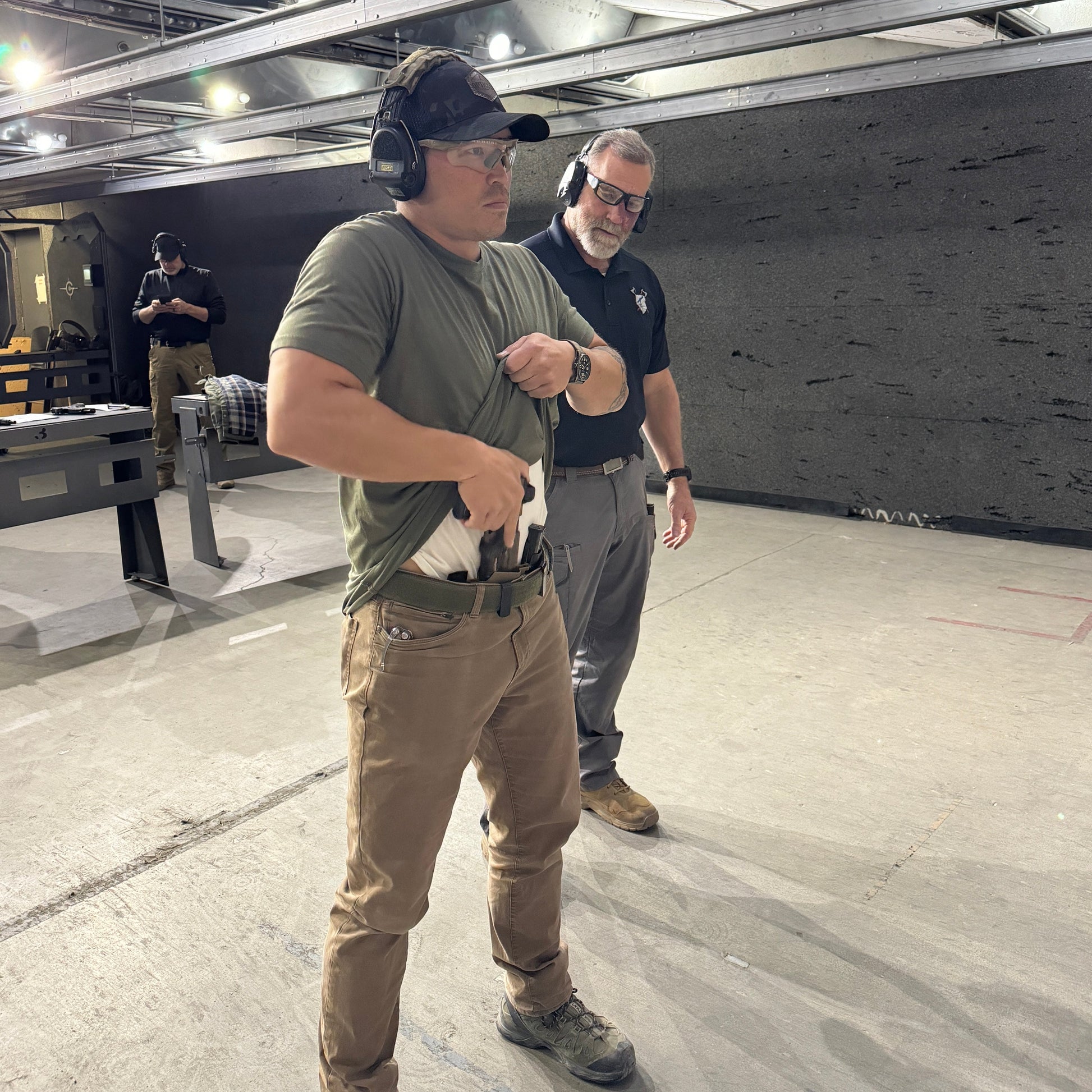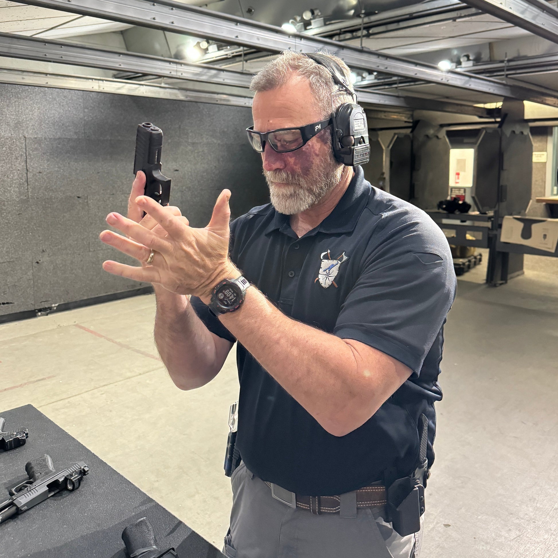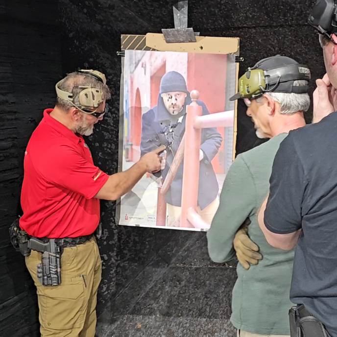 In our beginner courses, the gun is resting on the table with stationary shooting, we progress to starting a drill with their gun in hand in a ready position to shoot, then move to drawing from the holster, getting on target and shooting.