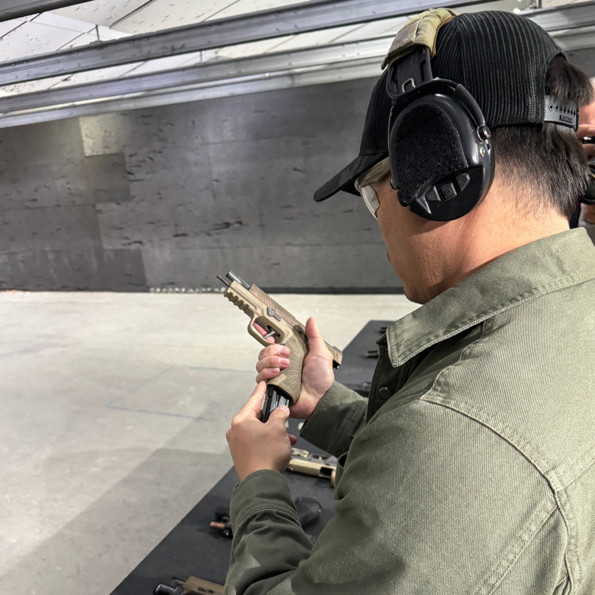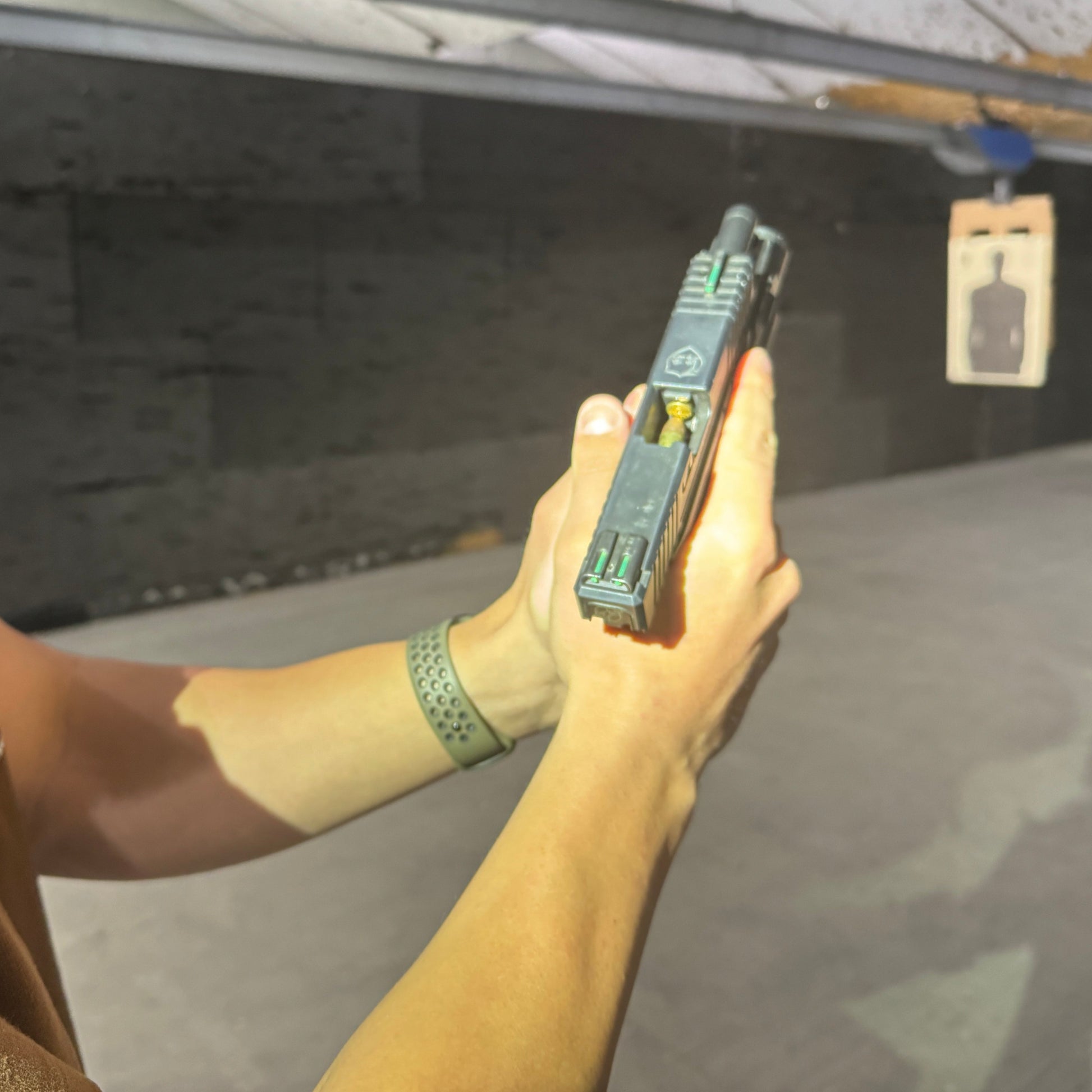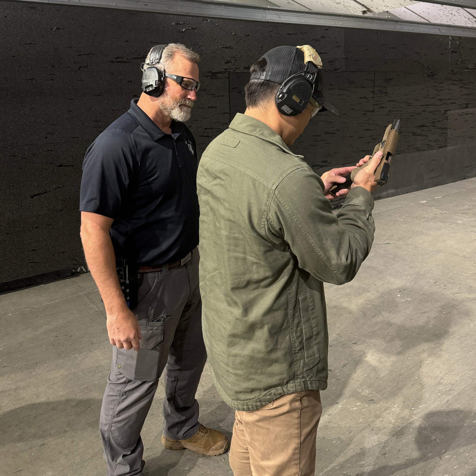 In our beginner courses, the gun is resting on the table with stationary shooting, we progress to starting a drill with their gun in hand in a ready position to shoot, then move to drawing from the holster, getting on target and shooting.