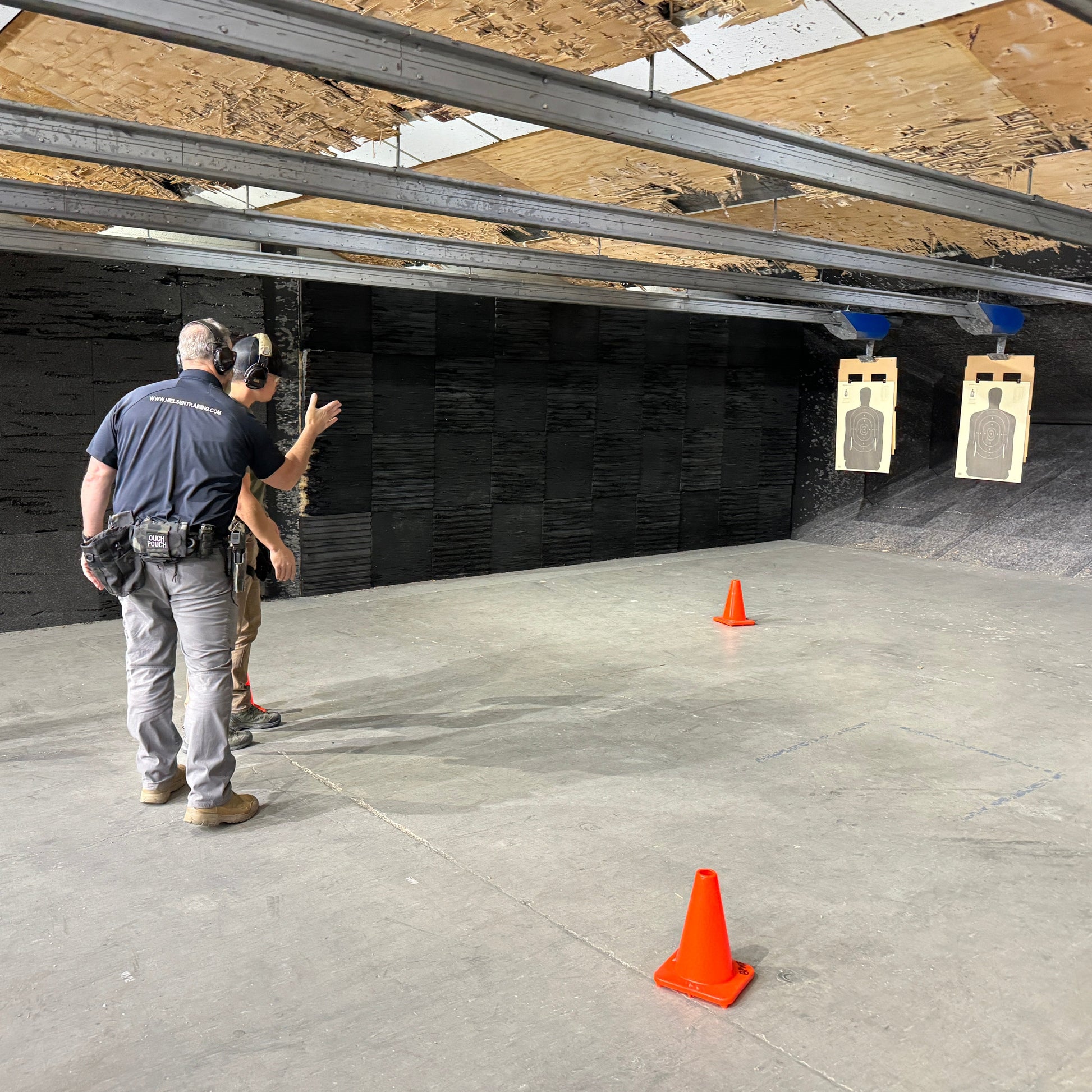 This class takes place in front of the normal firing line, we will be using multiple targets from varied distances and with set shooting locations. We generally will use cones or floor markings for movement paths to require varied footwork and balance.